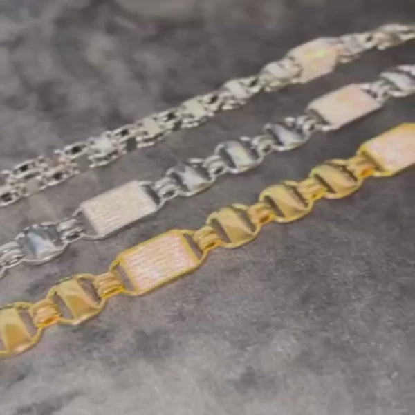 Design: Bold and heavy link style with a polished iced-out finish