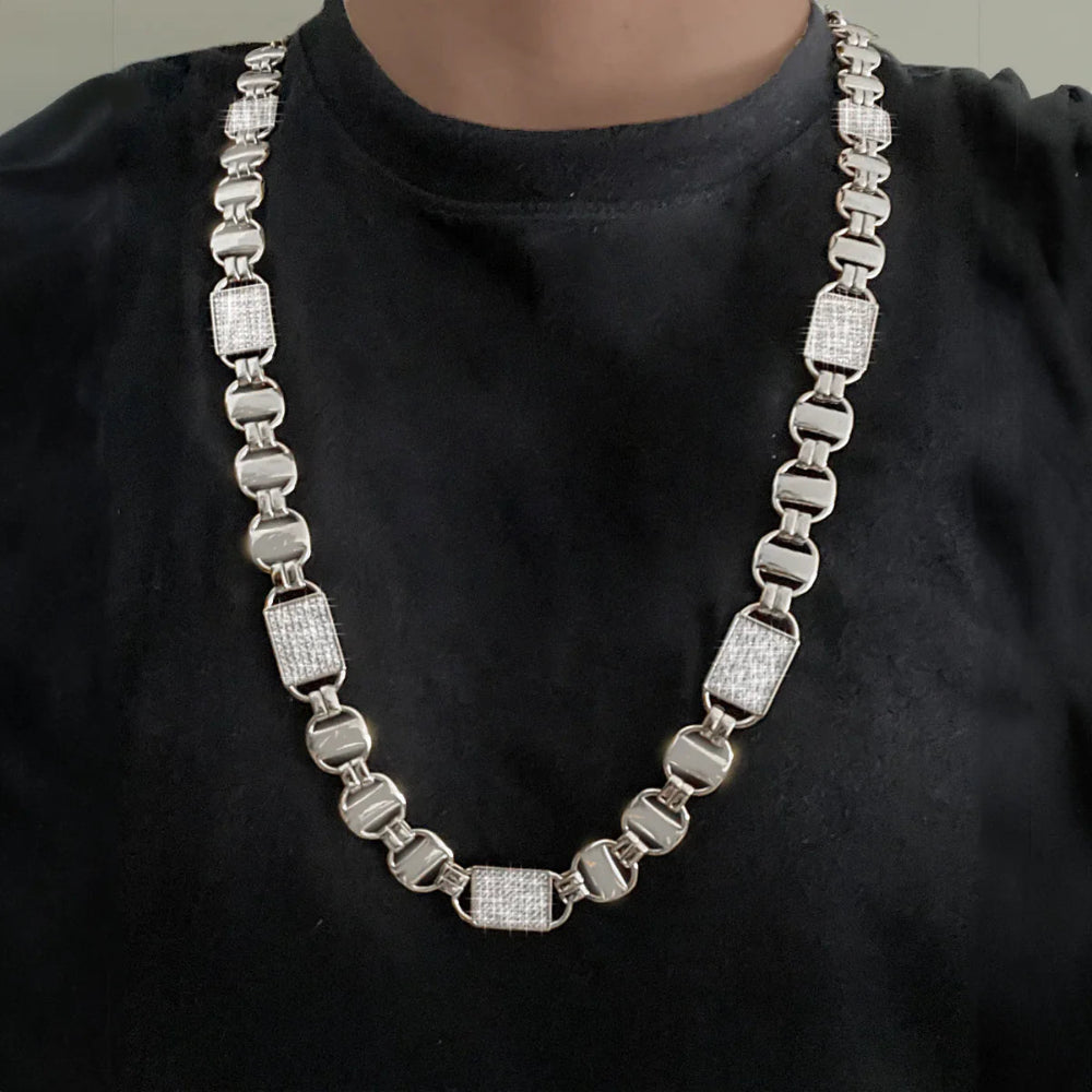 Design: Wide and heavy link structure with a polished iced-out finish